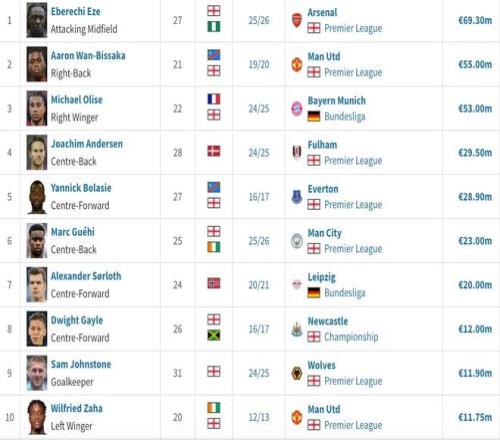 1. 埃泽 25-26赛季 >>阿森纳 6930万欧元